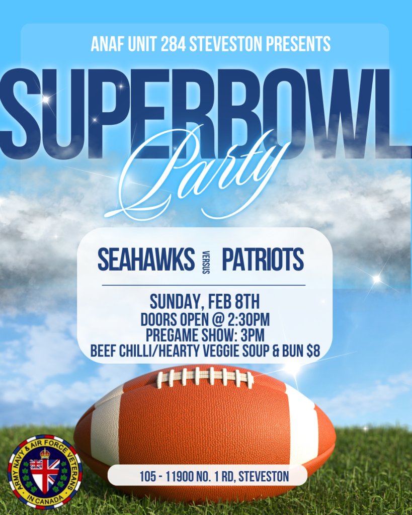 Join us for the Super Bowl! Doors open at 2:30pm; Chilli/Hearty Veggie Soup & bun $8 Kitchen opens at 3pm; Pregame show at 3pm;